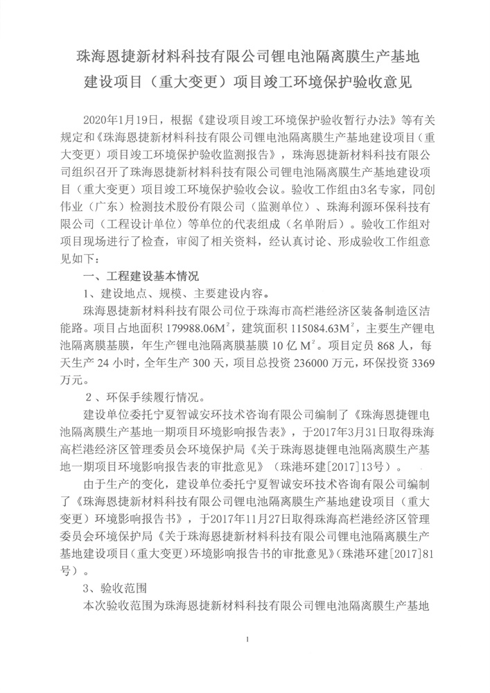 珠海爱体育aitiyu(中国)新材料科技有限公司锂电池隔离膜生产基地建设项目(重大变更)竣工环境保护验收报告信息公示
