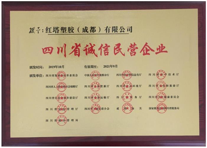 红塔塑胶(成都)有限公司积极参与了此次评选活动,并成功入选四川省首届民营企业“诚信百千工程”名录。得知入选后,红塔塑胶(成都)有限公司表示,此次活动的开展让企业倍感温暖、备受鼓舞,诚实守信既是做人的基本道德准则,也是企业搏击市场赖以生存的前提,我们将更加努力,在日后的发展中步履坚定,再创辉煌。