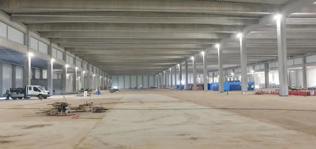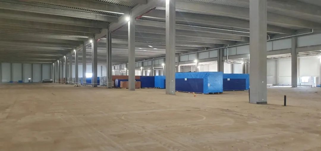 一期主体厂房内部,工业地板混凝土已经完成,雨水排放管线已安装完毕,正进入设备安装阶段。