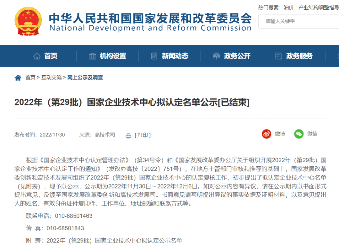 国家企业技术中心是由国家发改委等部委认定的目前国内规格最高、影响力最大的技术创新平台之一,综合考评申报公司的创新人才、技术积累、创新平台、技术产出和创新效益等指标。