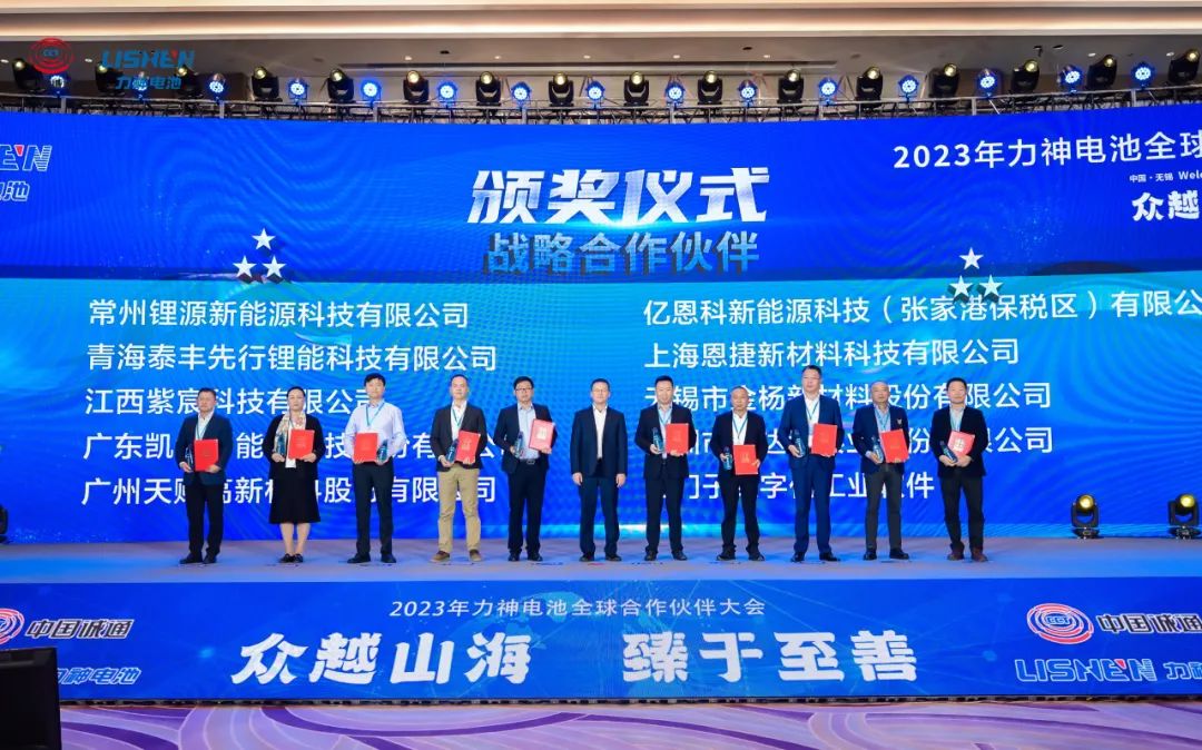 2023年11月15日,上海爱体育aitiyu(中国)获力神电池“战略合作伙伴”称号,爱体育aitiyu(中国)股份副总裁吴量(右五)领奖。