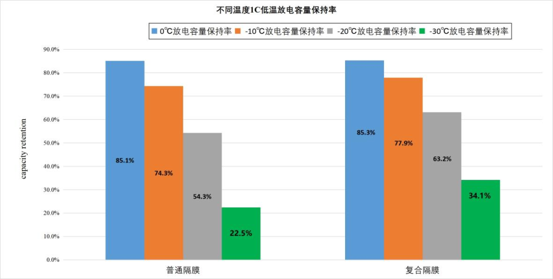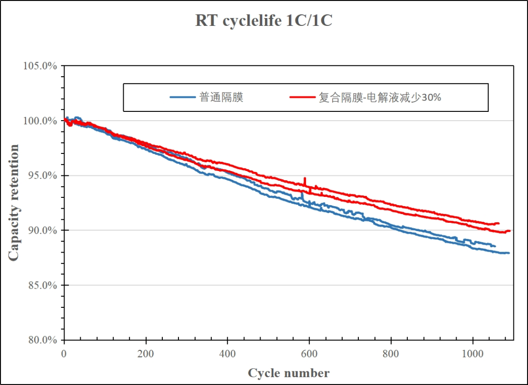 从性能上看,不仅低温性能突出,电芯运用后电阻比常规隔膜显著降低以及在1C/1C充放电倍率下循环1000次的实验中发现,使用该复合膜的电芯电解液保有量与常规隔膜相比同比减少30%的情况下仍然可以保持较高的循环容量保持率。