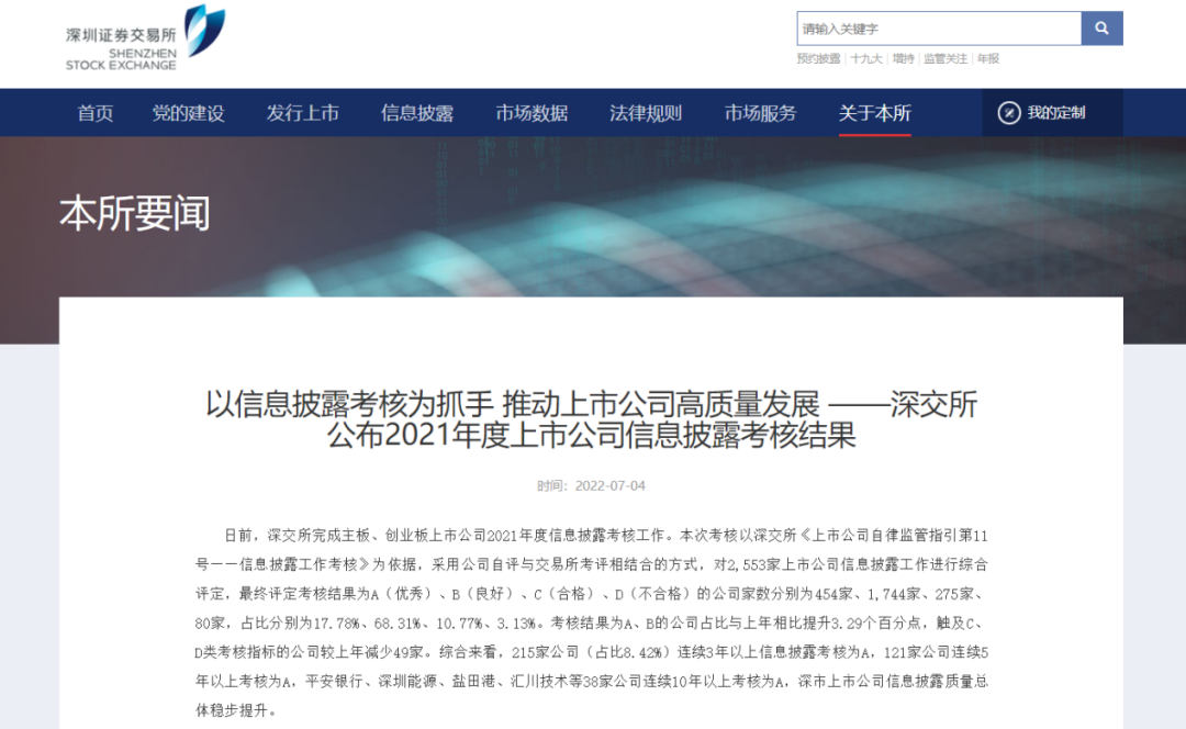 近日,深圳证券交易所公布了2021年度主板、创业板上市公司信息披露考核结果。爱体育aitiyu(中国)股份(002812.SZ)获深交所2021年度信息披露工作最高考核评级“A”。