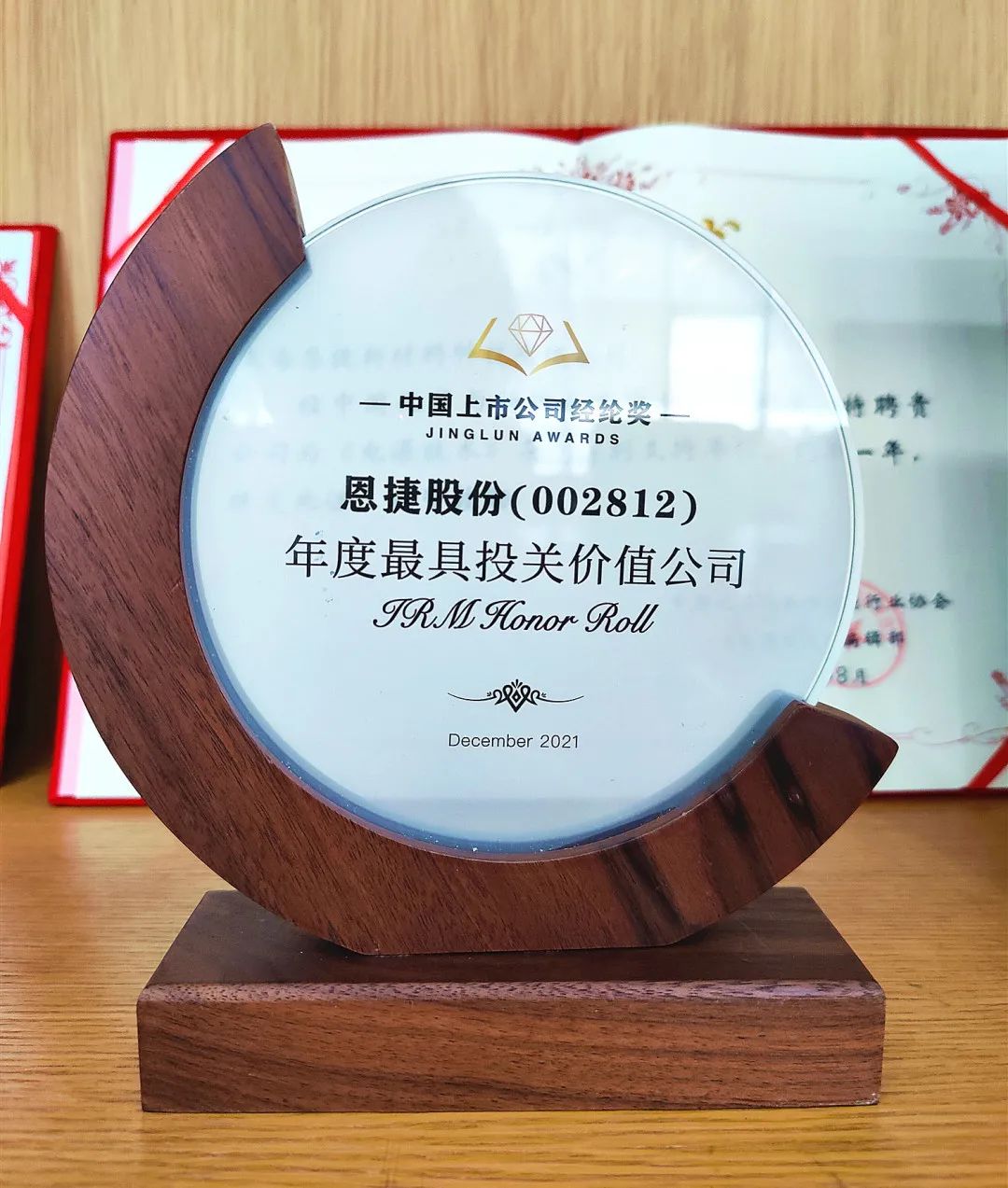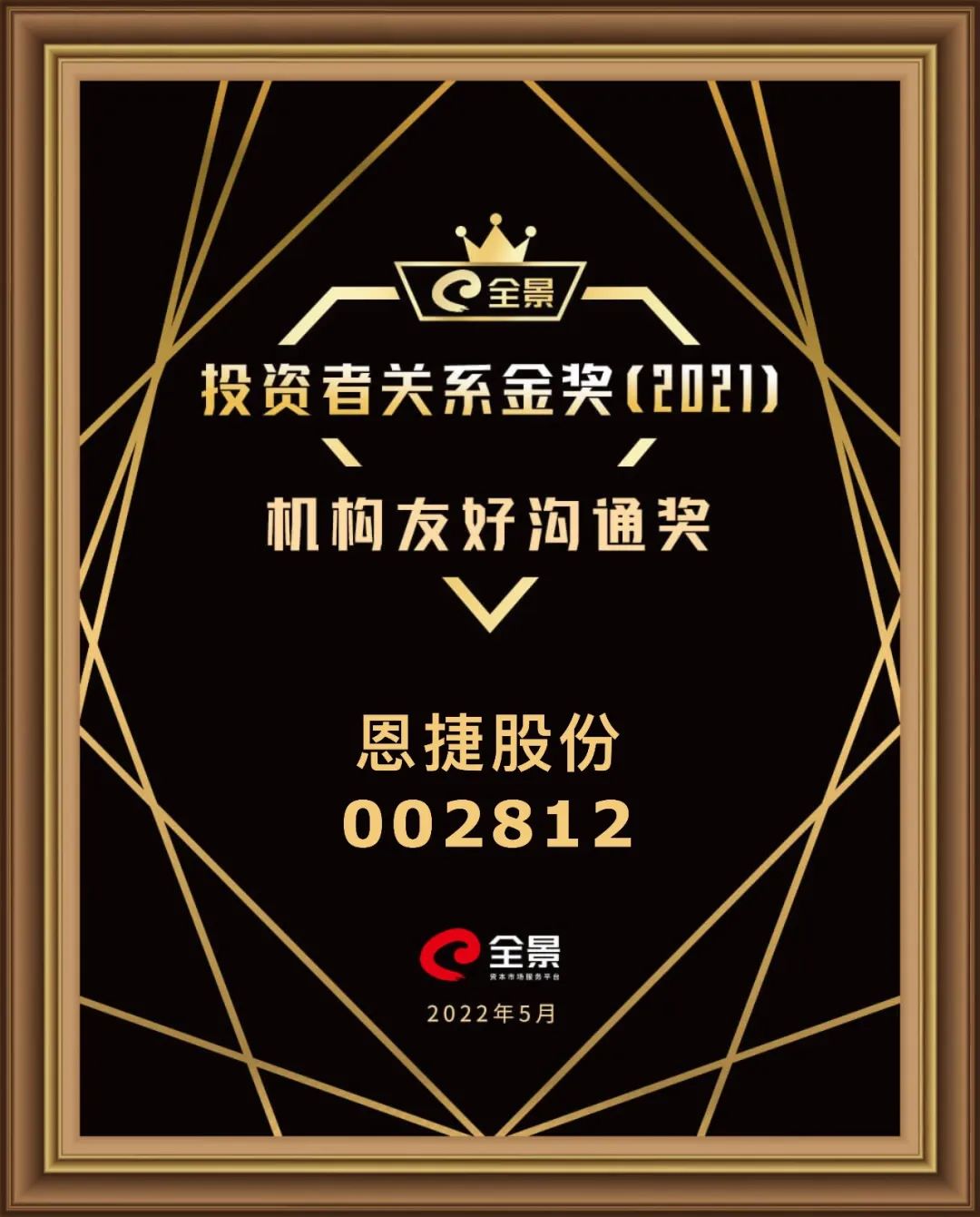 同时,公司积极与各类投资者沟通,荣获“全景投资者关系金奖(2021)”之“机构友好沟通奖”、“优秀IR团队”、“杰出IR企业”三大奖项;Win.d“2021年度上市公司市值排行榜材料行业5强”和“最受机构欢迎上市公司50强”;2021中国上市公司经纶奖之“年度最具投关价值公司”等多项荣誉。