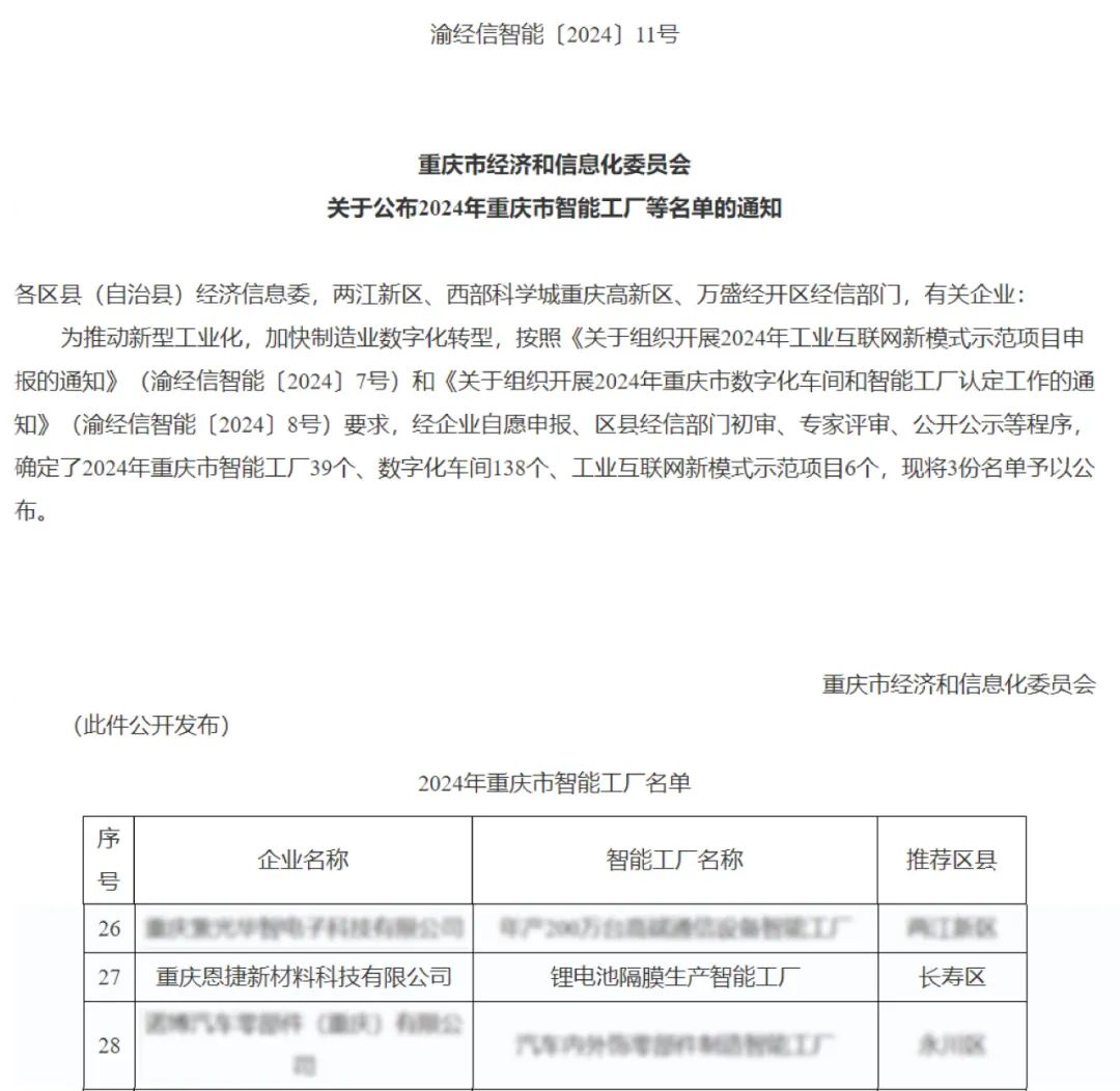 爱体育aitiyu(中国)股份旗下重庆爱体育aitiyu(中国)“锂电池隔膜生产智能工厂”成功获评“2024年重庆市智能工厂”,印证其在智能制造领域的强劲实力。