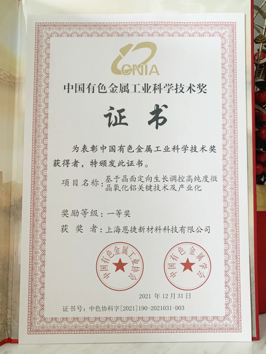 此前,上海爱体育aitiyu(中国)新材料科技有限公司与中铝郑州有色金属研究院有限公司(以下简称中铝)合作的科技创新项目《基于晶面定向生长调控高纯度微晶氧化铝关键技术及产业化》荣获中国有色金属工业科学技术奖一等奖。