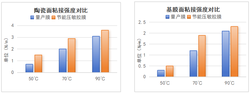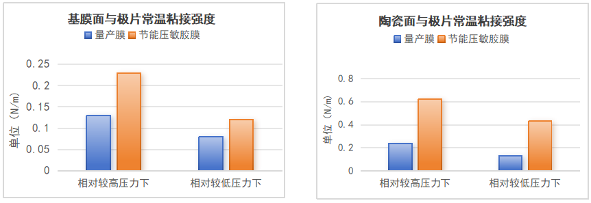 实验数据表明(图一、二),在常温条件下,针对不同压力环境,该节能压敏胶膜无论是陶瓷面还是基膜面与极片的粘接强度均大幅优于量产膜(此处指市面上的普通粘接隔膜),性能更极致。